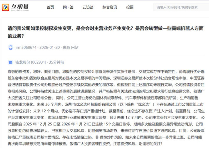 当日,锋龙股份在互动易平台上回复投资者提问称,未来36个月内,深圳市优必选科技股份有限公司不存在通过上市公司重组上市的计划或安排;未来12个月内,优必选不存在资产重组计划。截至目前,优必选不存在资产注入计划。